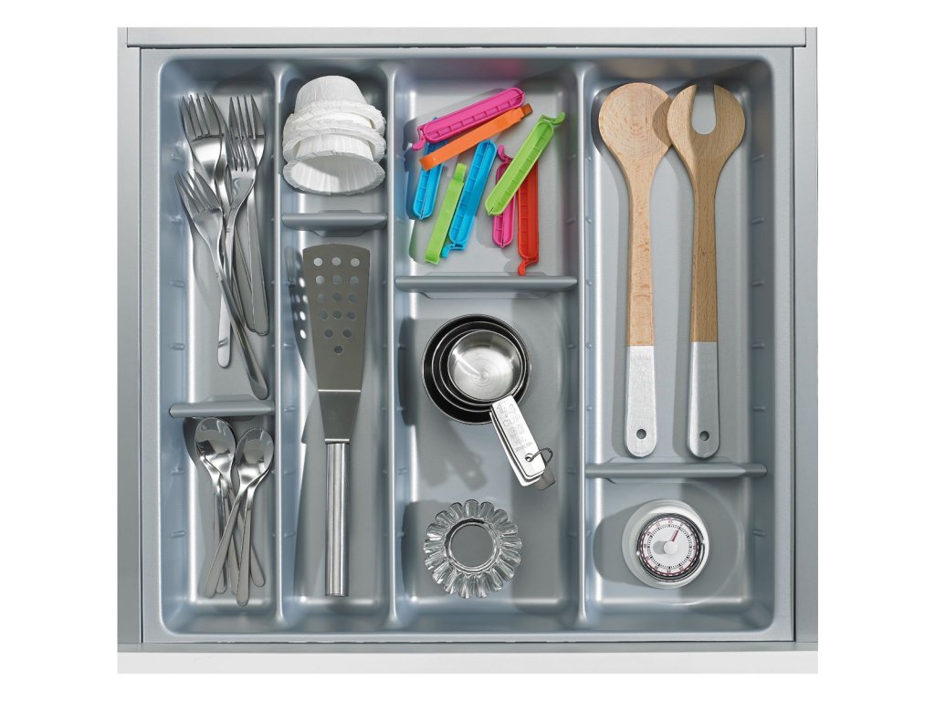 Vnitřní vybavení zásuvky InnoTech Atira. Určeno do korpusů standartní šířky, hloubky 470mm. Pro výšku boku zásuvky 70 mm. Sada obsahuje dělící prvky pro variabilní členění. Plast stříbrný.
