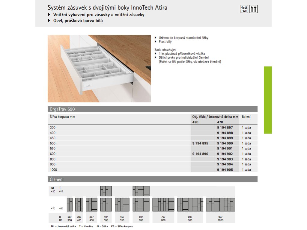 Vnitřní vybavení zásuvky InnoTech Atira. Určeno do korpusů standartní šířky, hloubky 470mm. Pro výšku boku zásuvky 70 mm. Sada obsahuje dělící prvky pro variabilní členění. Plast stříbrný.
