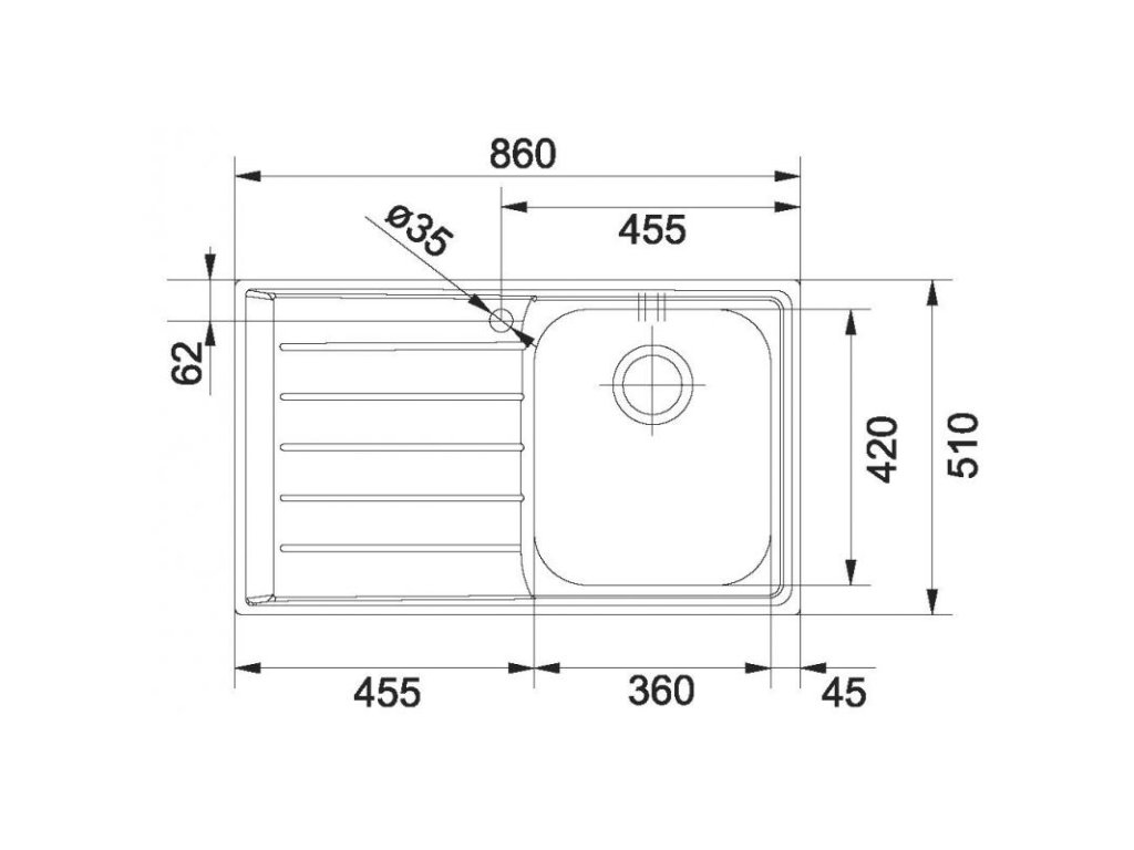 Nerezový dřez NEX 611 od výrobce Franke o rozměrech 860 x 510 mm.