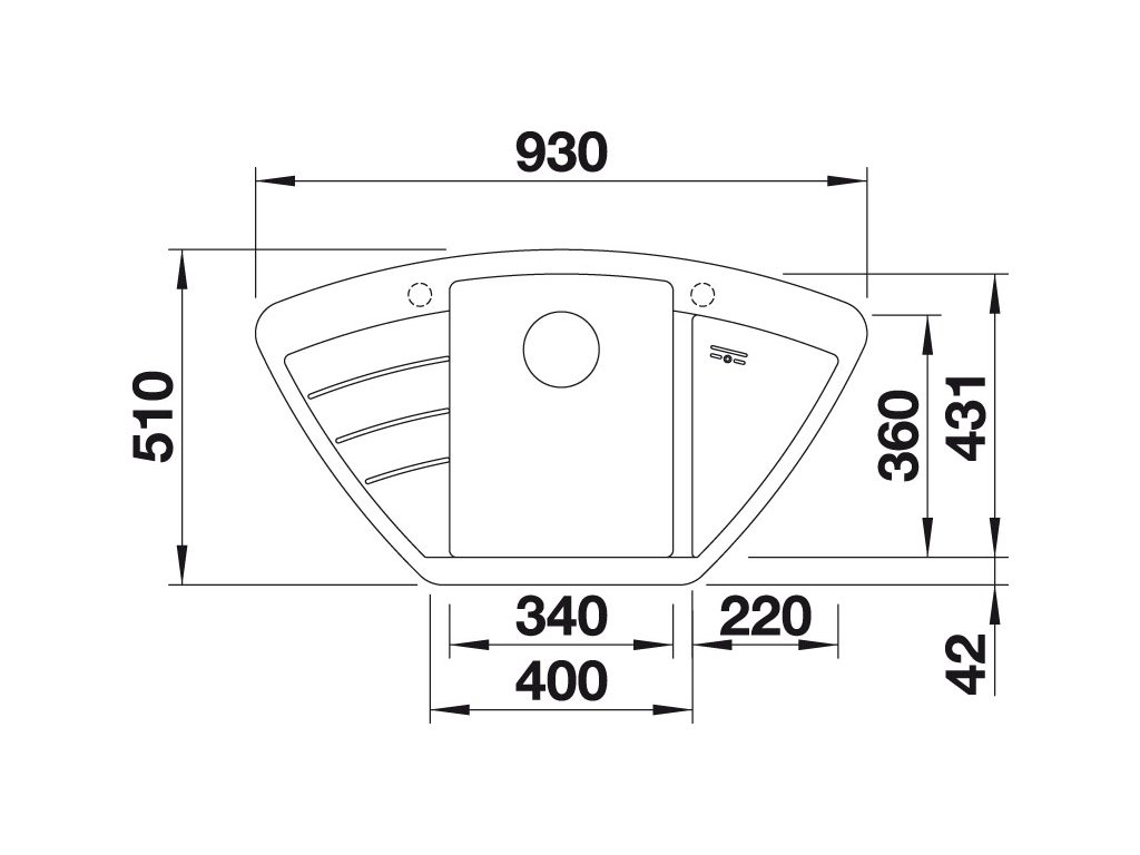 - mimořádně prostorný rohový jednodřez s odkapní plochou a plitkou přídavnou vaničkou určen pro horní montáž (usazen na pracovní desku)