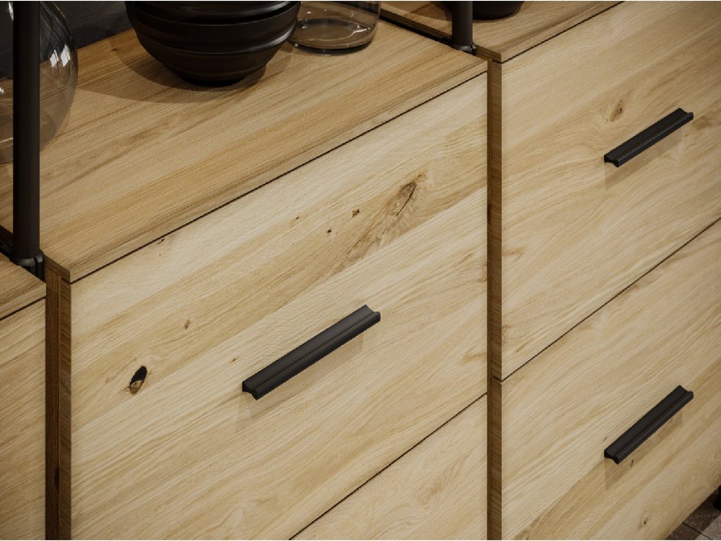 Úchytka má velmi ladný tvar, který po zavření dvířek působí velmi elegantně a neruší celistvost nábytkové sestavy. V kombinaci dřevodekoru dodá nábytku šmrnc.