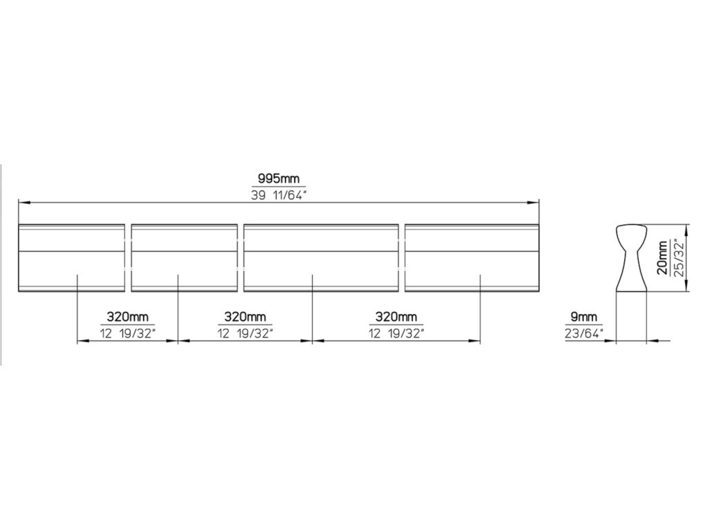 Délka: 995 mm, Rozteč: 3x320 mm, Šířka: 9 mm, Výška: 20 mm