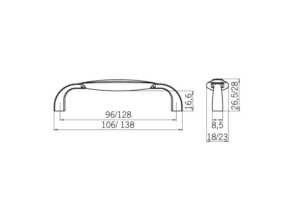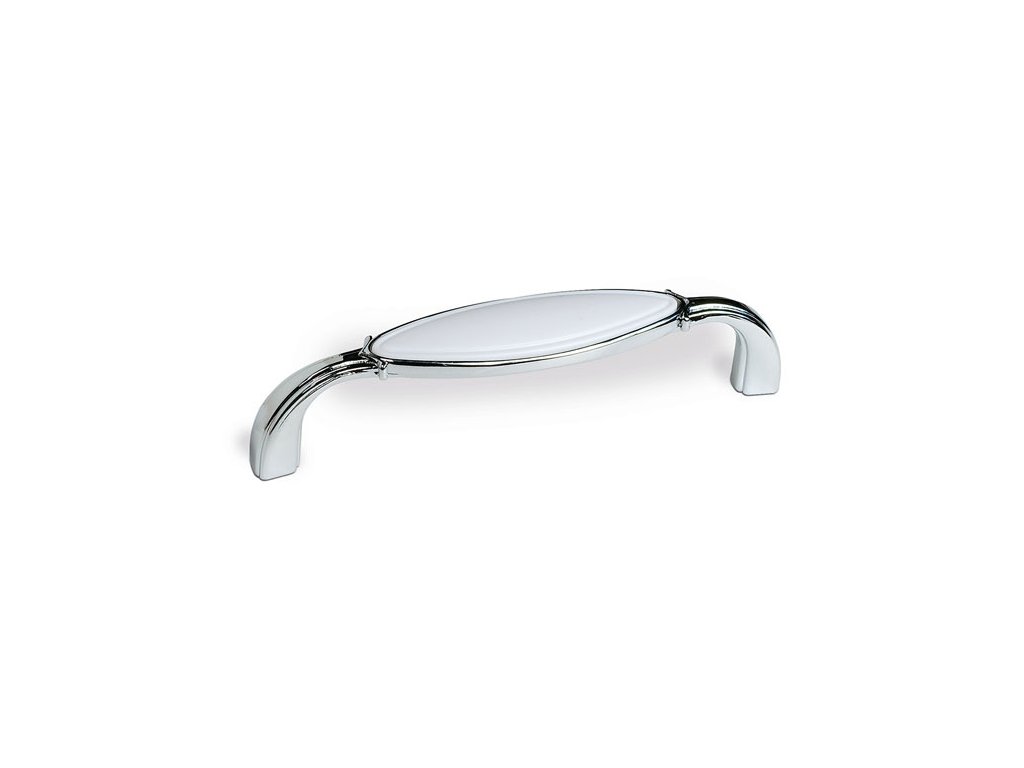 Tato úchytka má elegantní, zaoblený design s chromovaným povrchem, který jí dodává moderní a lesklý vzhled. Ve středu má oválnou bílou plastovou vložku, která dodává kontrast a jemnost. Tento typ úchytky se hodí do moderních i klasických interiérů, kde může zvýraznit stylový a čistý vzhled nábytku. Vhodná je zejména pro kuchyňské skříňky nebo komody.