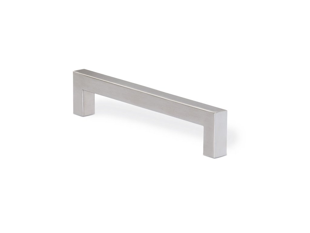 Na obrázku je moderní nábytková úchytka SIRO s minimalistickým designem. Je vyrobena z nerezi s matným stříbrným povrchem a má jednoduchý, pravoúhlý tvar. Celá úchytka je rovná, hranatá a geometricky přesná, s ostrými rohy a rovnými liniemi. Tento styl úchytky je ideální pro moderní a minimalistické interiéry, kde je kladen důraz na čisté a nenápadné prvky. Je vhodná pro kuchyňské linky, skříně nebo zásuvky v moderním nebo industriálním stylu.