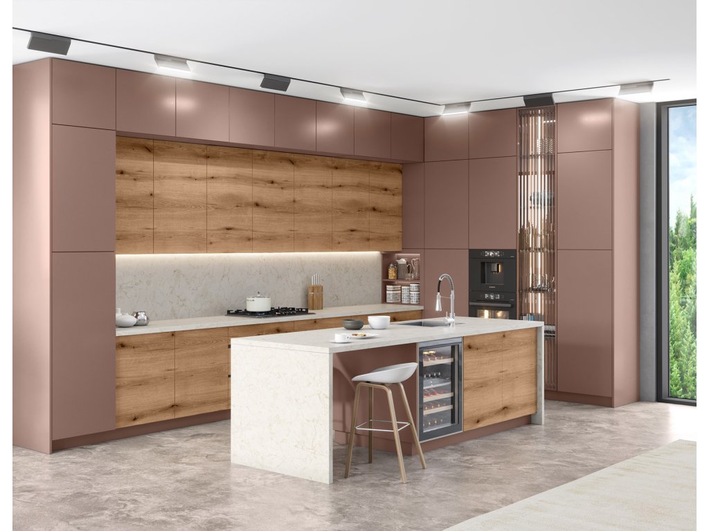 Ucelený vzhled kuchyně získáte, že k pracovním deskám zakoupíte zádovou desku (zástěnu), který je dostupný ve všech dekorech pracovních desek Kronospan.