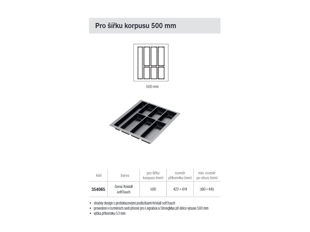 Příborník Classico Kristall Soft Touch 50 pro přehledné uspořádání příborů a kuchyňského náčiní. Provedení Kristal soft Touch v barvě černé. Rozměry odpovádají rozměrům BLUM Legrabox v hloubce 500 mm pro korpus šířky 50 cm. Rozměry lze ořezáním upravit na požadovaný rozměr v rozsahu rozměrů příborníku.