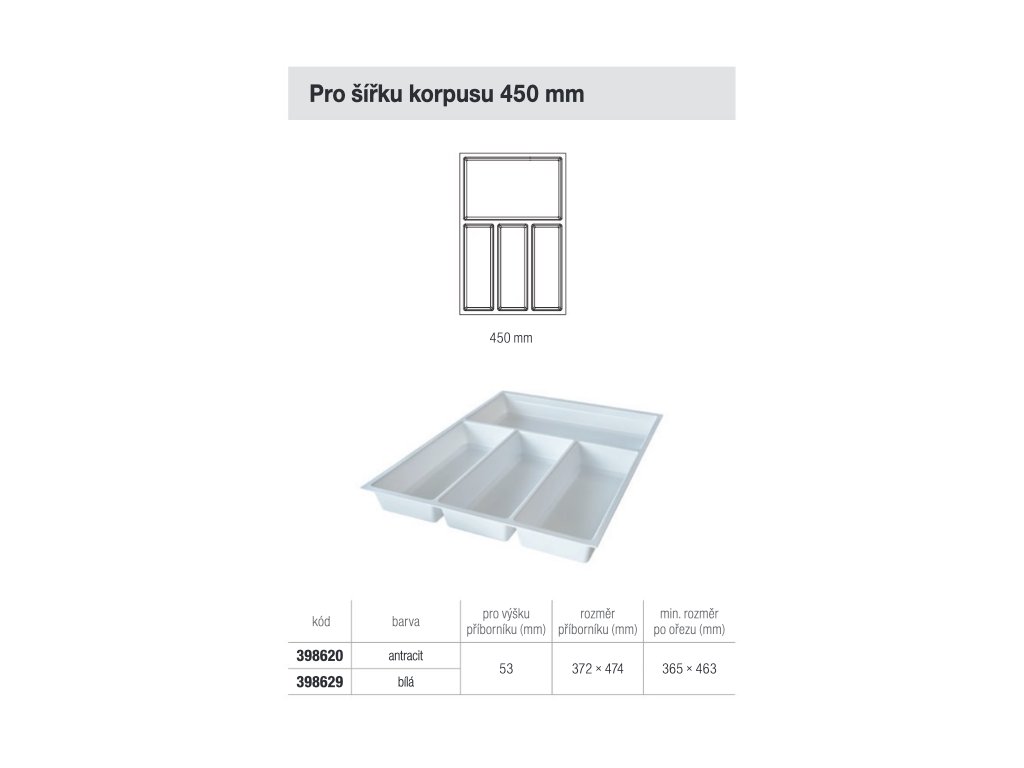 Příborník Sky 45 pro přehledné uspořádání příborů a kuchyňského náčiní. Kombinace pevných přihrádek a pohyblivých přepážek (k dokoupení zvlášť). Pro různé typy zásuvkových systémů - StrongMax, Legrabox, nebo i jiné typy (rozměry možno přizpůsobit ořezáním).
