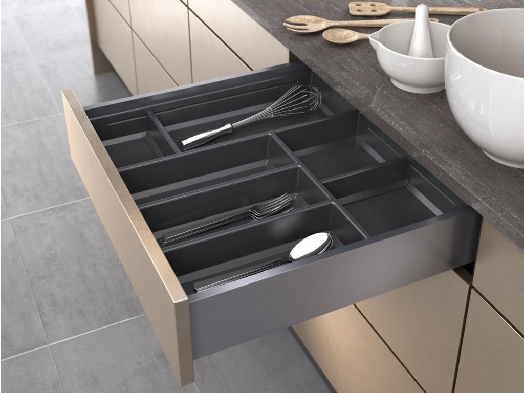 Příborník Sky 80 pro přehledné uspořádání příborů a kuchyňského náčiní. Kombinace pevných přihrádek a pohyblivých přepážek (k dokoupení zvlášť). Pro různé typy zásuvkových systémů - StrongMax, Legrabox, nebo i jiné typy (rozměry možno přizpůsobit ořezáním).