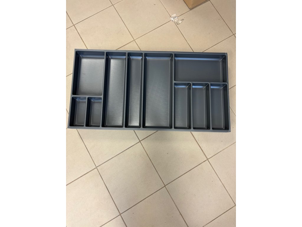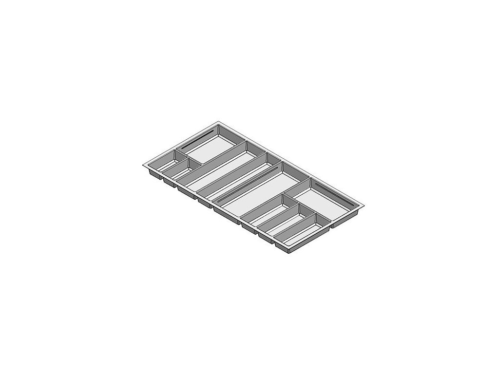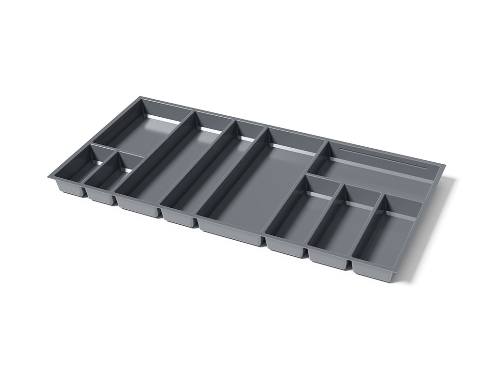 Vložka příborníku SKY pro zásuvky blum Antaro a užší - šířka korpusu 1000mm. Kombinace pevných přihrádek a pohyblivých přepážek (k dokoupení zvlášť). Pro užší typy zásuvkových systémů možno zúžit a zkrátit. Barva antracit.