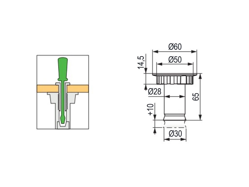 Výška nožky 65 mm s možností rektifikace +10mm.