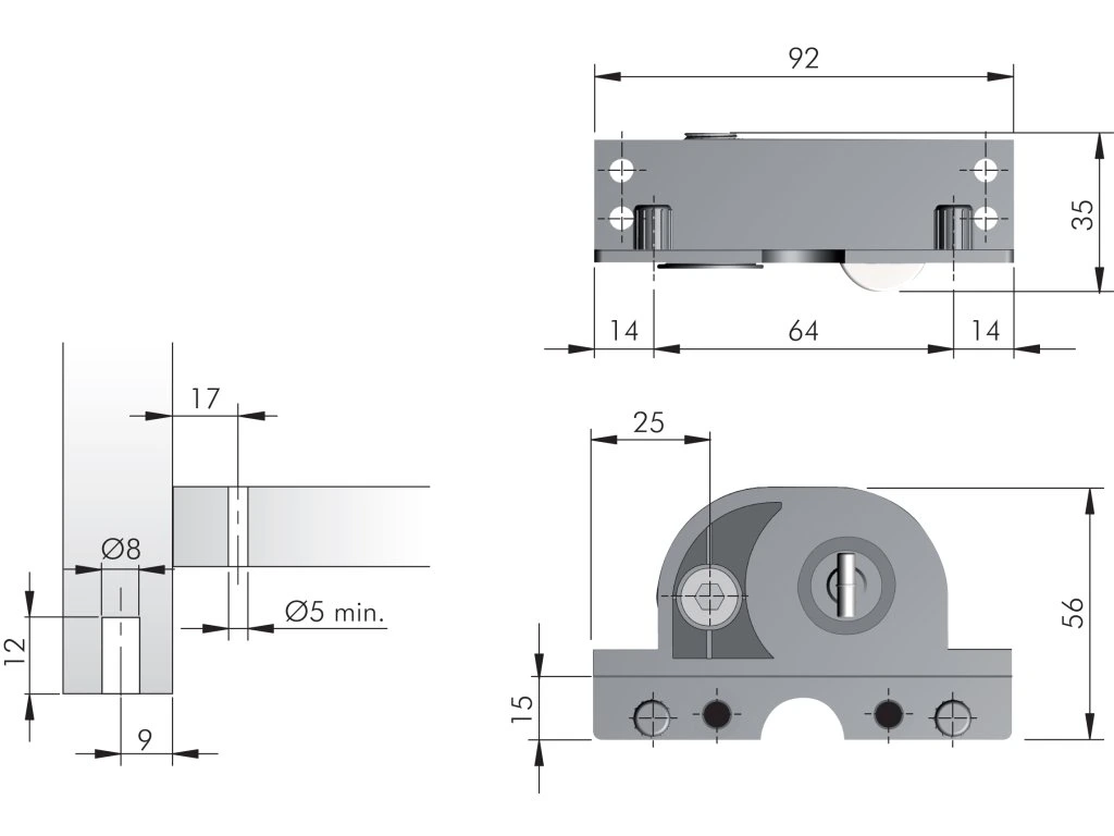 Stavěcí nožka s kolečkem, včetně narážecích pinů do korpusu na boku, barva černá